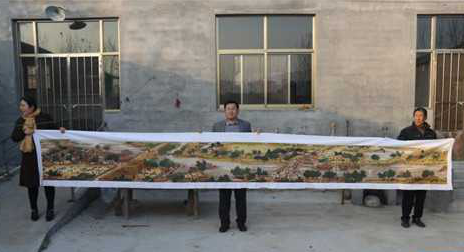 一大卷格布徐徐鋪展開(kāi)來(lái),一幅六米長(zhǎng)的清明上河圖十字繡慢慢呈現(xiàn)在眼前,各式造型栩栩如生,讓人為之贊嘆。這是近日山東省平陰縣孔村鎮(zhèn)半邊井村趙慶平花費(fèi)兩年半時(shí)間繡出的作品。
