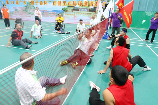 據(jù)介紹,坐式排球是專為雙下肢殘疾人設計的一種坐地面打的排球活動,比賽采用6人排球規(guī)則,只是增加了比賽中擊球時擊球員臀部不得離地這一規(guī)定。活動當天,排球場上16支隊伍隨機分組廝殺,勝出者再分組比拼,最終決出前10名。比賽精彩而激烈,其中由各地肢協(xié)主席組成的主席隊與廣東省和肇慶市殘聯(lián)工作人員組成的殘聯(lián)機關隊的比賽最引人注目。孫俊明、吳獻忠、吳江龍等領導紛紛上場直接參賽,與廣大殘疾人融為一體,贏得了現(xiàn)場觀眾陣陣喝彩。由于其他隊伍都有一定的坐式排球訓練基礎,雖然省殘聯(lián)機關隊大多是健全人,但在比賽中失誤連連,而對手則打得風生水起,予取予求。