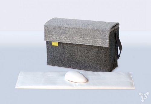 氣泵箱:這個(gè)迷你箱子依靠一根軟管與枕頭墊相連,看上去很有時(shí)尚感,跟任何房間都很搭哦。箱子里包含了所有的電子設(shè)備:無(wú)聲氣泵、音頻接收器、動(dòng)力裝置和電池,可一直插在家里的插座上使用。外出攜帶也很便,將鵝卵石傳聲器和枕頭墊一起放在箱子里帶走就OK啦。