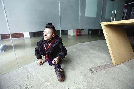 記者看到,身高不足1米、體重25公斤的楊昌國長著一張娃娃臉,雞公頭打了啫喱水定型,看起來異常精神。他右手拿著一塊長5厘米、寬3厘米、高4厘米的木頭,左腳每向前邁進一步,拄著木頭的右手便立馬跟了上來,然后左手扶著左腿,右腿又往前移動。如果不是知情人,你很難把他和重慶優客尚品電子商務有限公司的副總裁聯系起來。